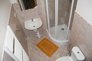 Badezimmer: Dusche, Waschbecken, Spiegel, WC
